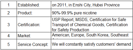 Wir haben Nikotin Sulfat, 90 % Nikotin, 95 % Nikotin, Nikotin 98 %, 99 % Nikotin und über 99,5 % Nikotin, 995mg/ml Nikotin, 999mg/ml Nikotin.