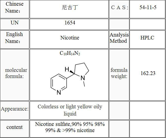 Wir haben Nikotin Sulfat, 90 % Nikotin, 95 % Nikotin, Nikotin 98 %, 99 % Nikotin und über 99,5 % Nikotin, 995mg/ml Nikotin, 999mg/ml Nikotin.